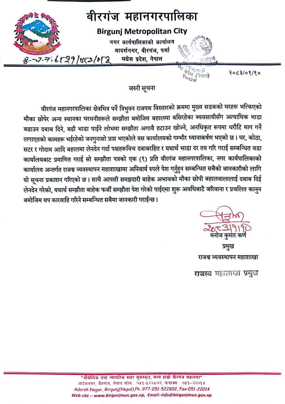 घर, कोठा, सटर र गोदाम आदि बहालमा लेनदेन गर्दा पक्षहरूबीच दबाबरहित र यथार्थ भाडा दर तय गरी– गराई सम्बन्धित वडा कार्यालयबाट प्रमाणित गराई सो सम्झौतापत्रको एक प्रति वीरगंज महानगरपालिका, नगर कार्यपालिकाको कार्यालय अन्तर्गत राजश्व व्यवस्थापन महाशाखामा अनिवार्य रूपले पेश गर्नुहुन महानगरपालिकाले सूचना प्रकाशन गरेको छ।