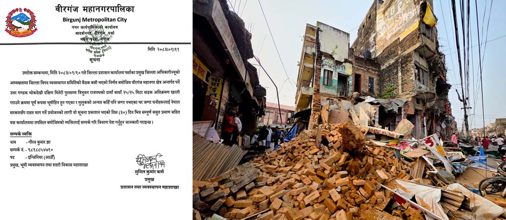 वीरगंज, १० वैशाख । वीरगंज महानगरपालिका क्षेत्रभित्र पर्ने त्रिभुवन राजपथ विस्तारको क्रममा मुख्य सडकको घरहरू भत्किएको मौका छोपेर अन्य स्थानका घरधनीहरूले सम्झौता बमोजिम बहालमा बसिरहेका व्यवसायीसँग अत्याधिक भाडा बढाउन दबाव दिने, बढी भाडा पाईने लोभमा सम्झौता अगावै हटाउन खोज्ने, अनधिकृत रूपमा धरौटि माग गर्ने लगायतको कामहरू भइरहेको जनगुनासो प्राप्त भएपछि वीरगंज महानगरपालिका कार्यालयको गम्भीर ध्यानाकर्षण भएको छ ।